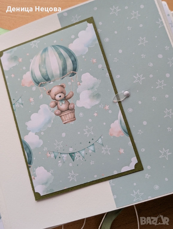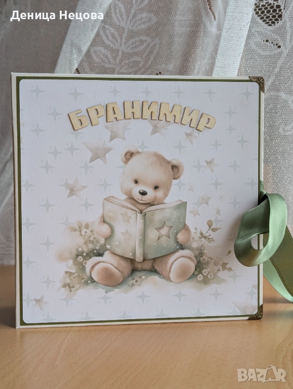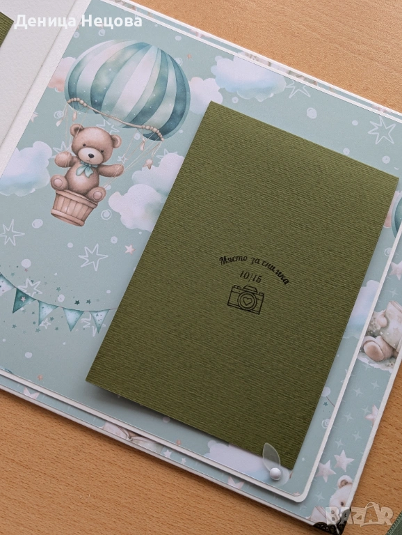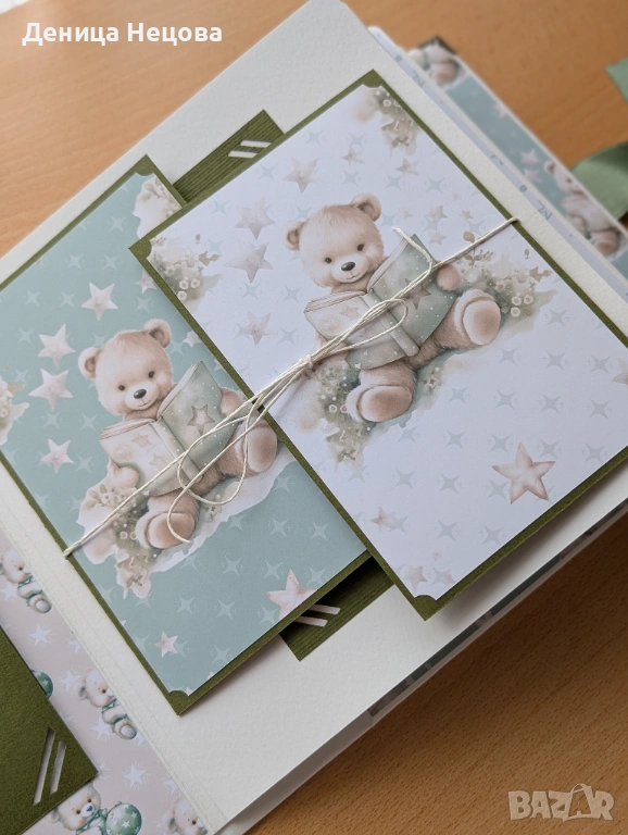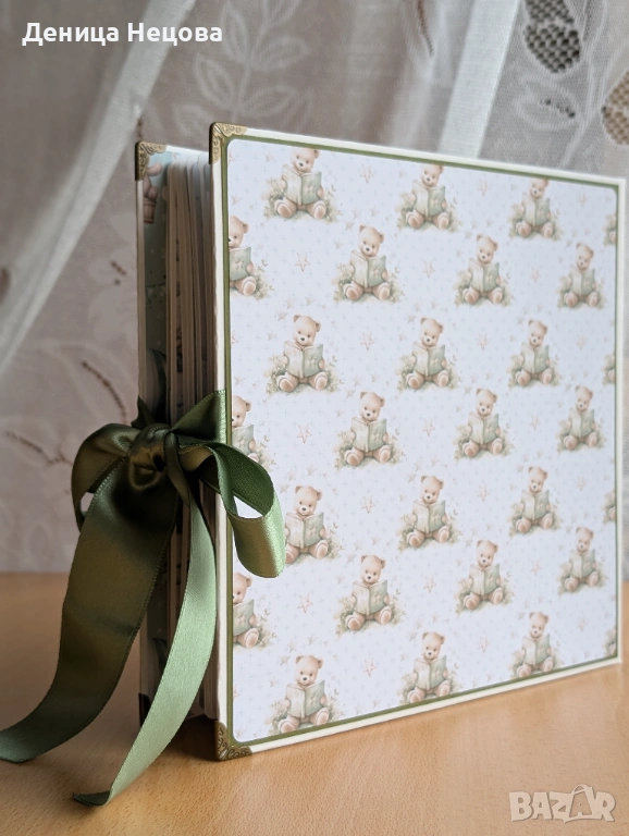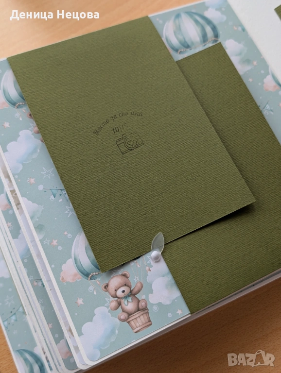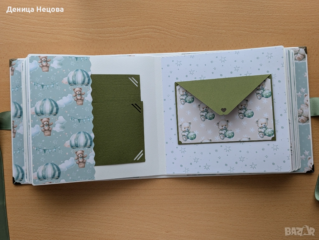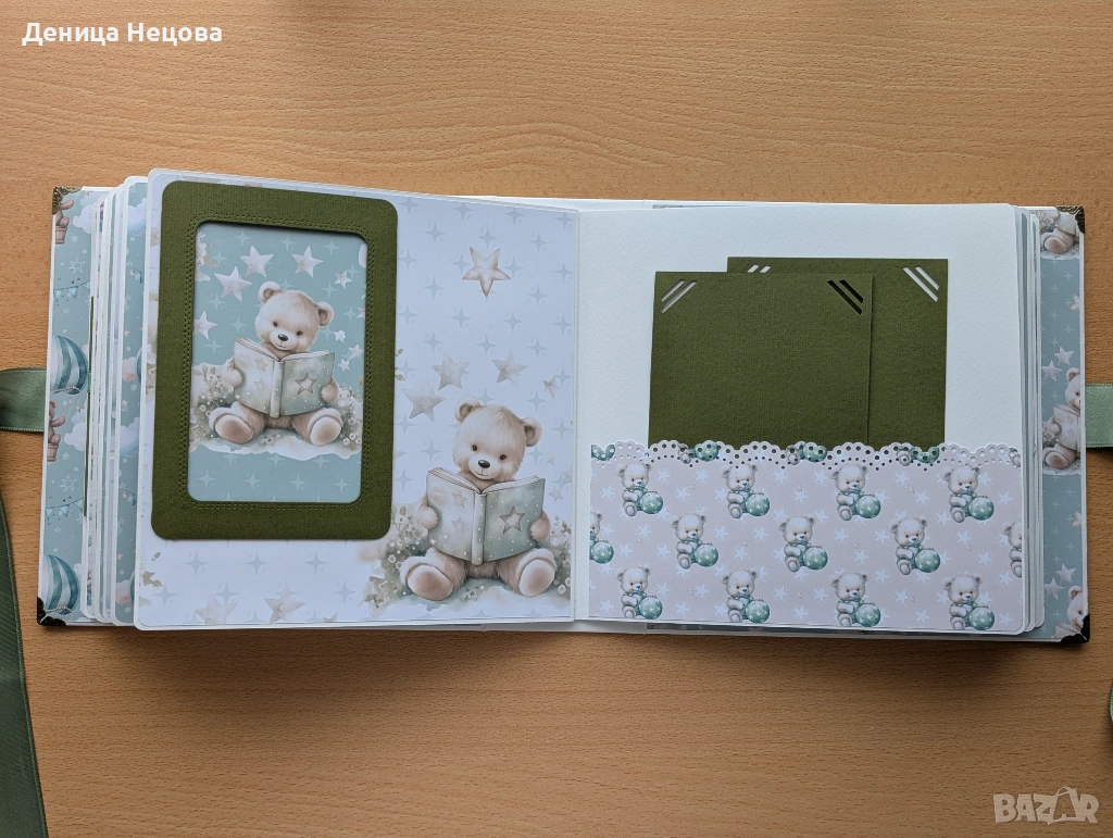 Детски ръчно изработен албум за снимки зелени мечета, подарък за погача, подарък за дете, рожден ден
