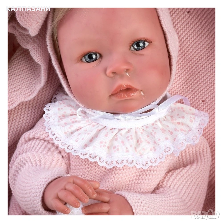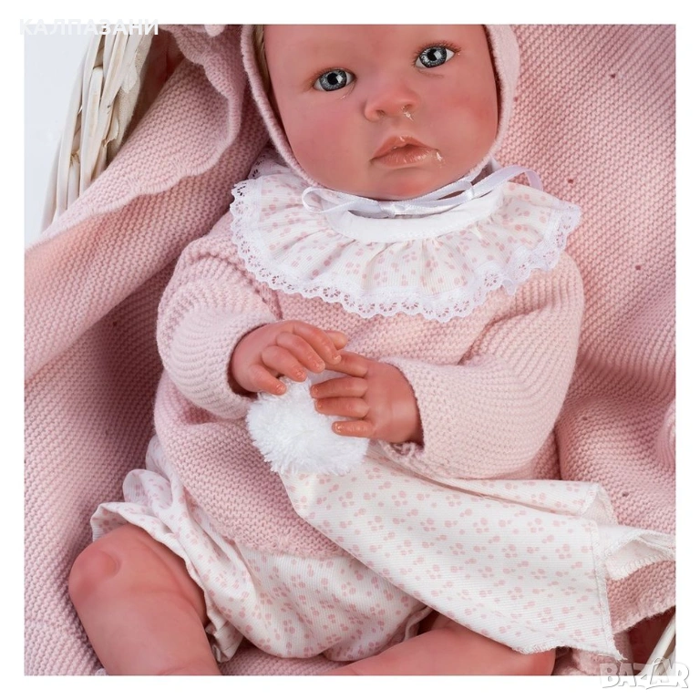 Това може да бъде първото приятелче в живота, на вашето дете. То е едно от най-реалистичните бебета, създадено с усещане за гладка и зачервена кожа, и френски маникюр. Куклата има руса коса, облечена е с розова блуза, шапчица и има играчка за гушкане.