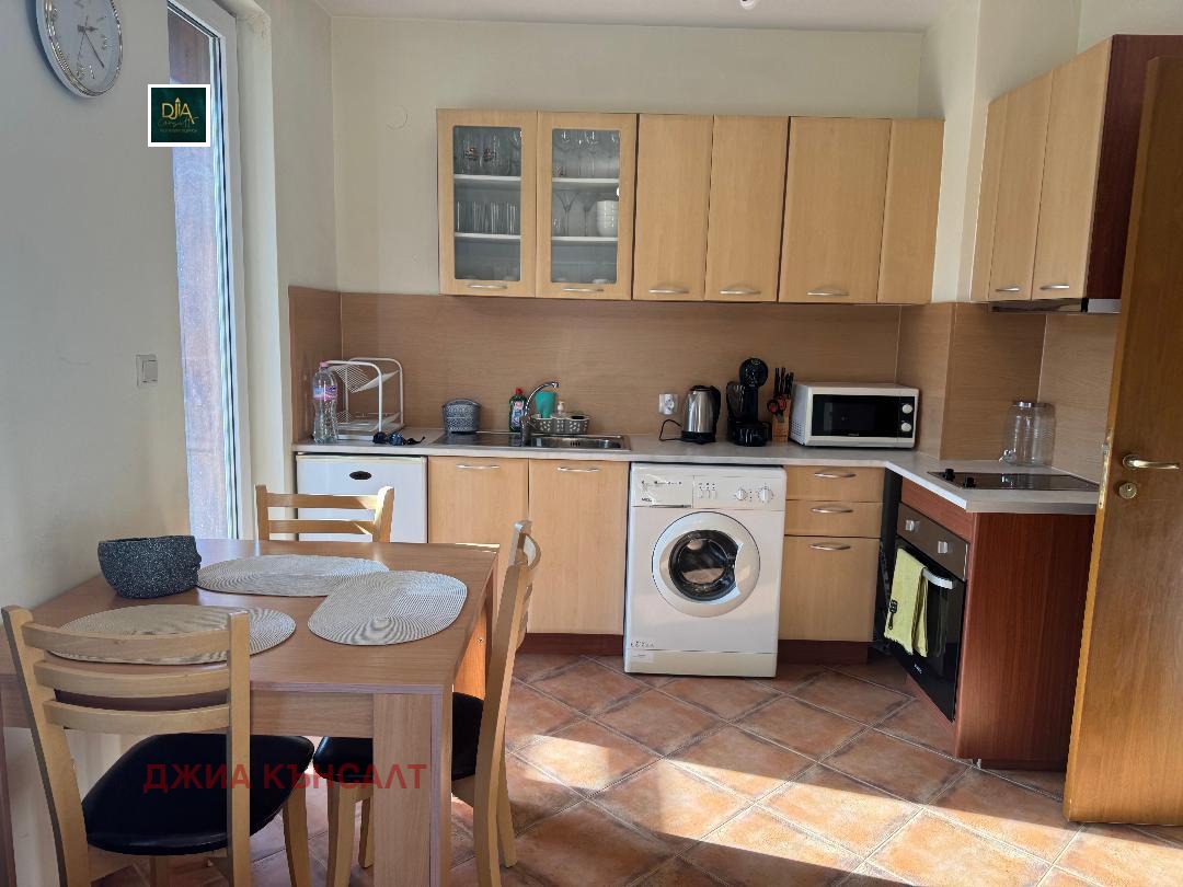 Жилището е решено като отворено пространство, с топла и уютна атмосфера. Кухненската зона е напълно оборудвана с котлони, фурна, микровълнова, хладилник с фризер, пералня, кафемашина Dolce Gusto и абсорбатор.