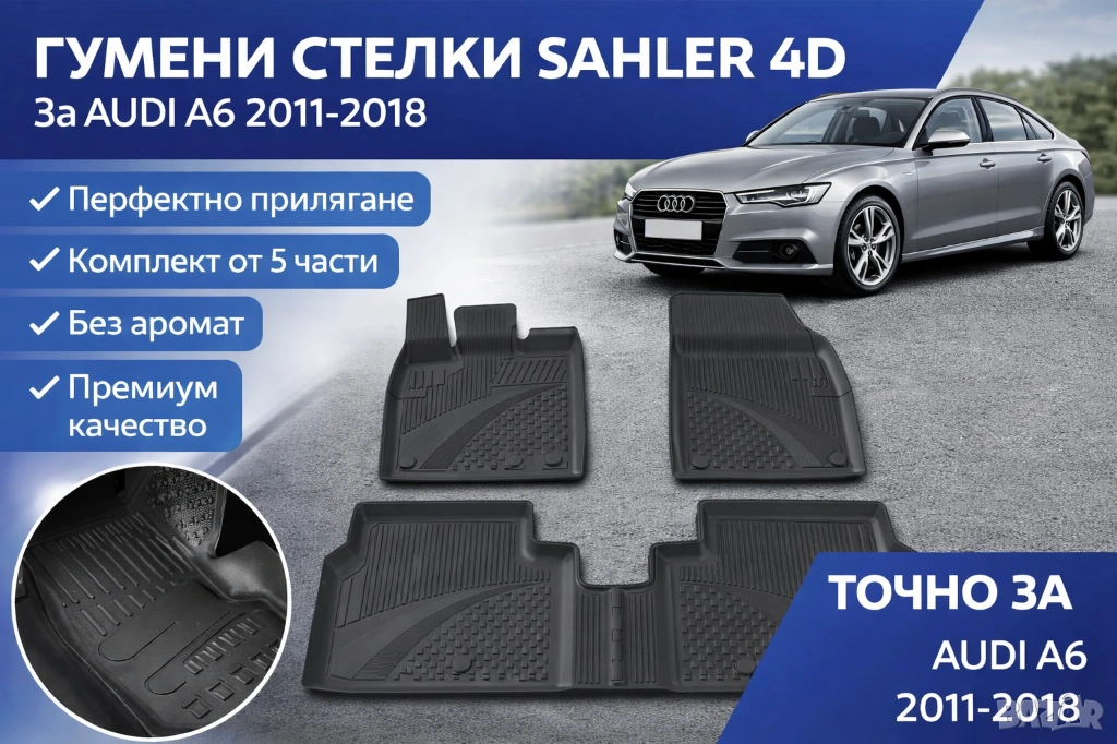 Висококачествени гумени стелки Sahler 4D, изработени специално за Audi A6 (2011–2018 г.). Осигуряват пълна защита на пода и перфектно прилягане по формата на купето.