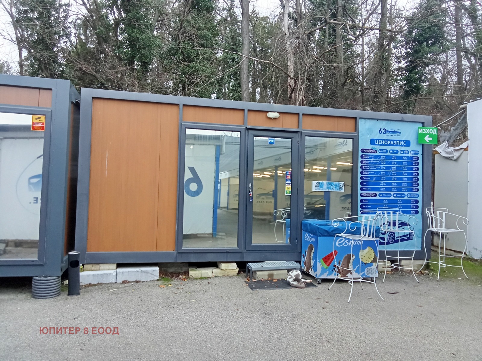 Обектът се отдава под наем от собственика. Продажба на бизнес и оборудване на досегашния наемател на цена 115000 евро, включващи: два нови контейнера /офис със СВ и кафе с размери съотв. 2х6 метра и 3х6 метра, два гаранционни климатика Мицубиши, принтер, хладилник, диван, пералня, 2 нови телевизора, 66 бр. Осветителни тела, маси и столове, компресор, фенери, екстрактори, винтоверт, две машини за пастиране, оборудвания за миячи- 4 бр., кафе Вендинг машина 2 в 1, 4 водни помпи, дозиращи помпи за препарат, 5 прахосмукачки, бидони, омекотители, хидрофлор, две помпи за високо налягане, 4 пистолета водоструйки и др.