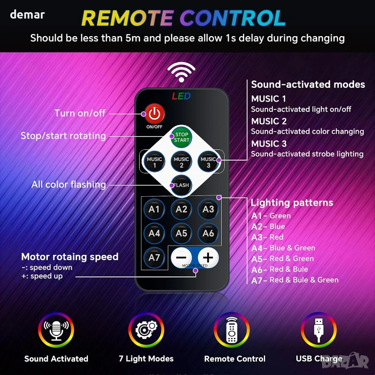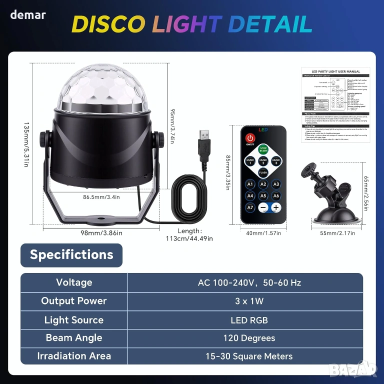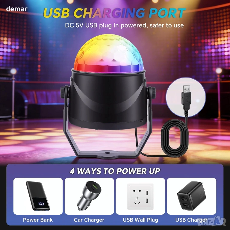 Тази компактна диско лампа предлага множество режими на смесване на цветове и осветление, за да създаде оживена парти атмосфера, включително звуково активирани ефекти, които синхронизират промените в осветлението и скоростта с музика или околен звук. Леката ѝ, преносима куполообразна конструкция позволява гъвкаво поставяне на маси, подове, бюра или монтаж на стени и тавани. Захранвана чрез USB, тя работи лесно с лаптопи, външни батерии, зарядни за кола и други устройства, а включеното безжично дистанционно ви позволява да контролирате захранването, режимите, звуковото активиране, въртенето и скоростта на светкавица от разстояние. С пълно 360° въртене, тя е подходяща за широк спектър от вътрешни и външни поводи, от партита и тържества до непринуден декор на стаи и забавления.