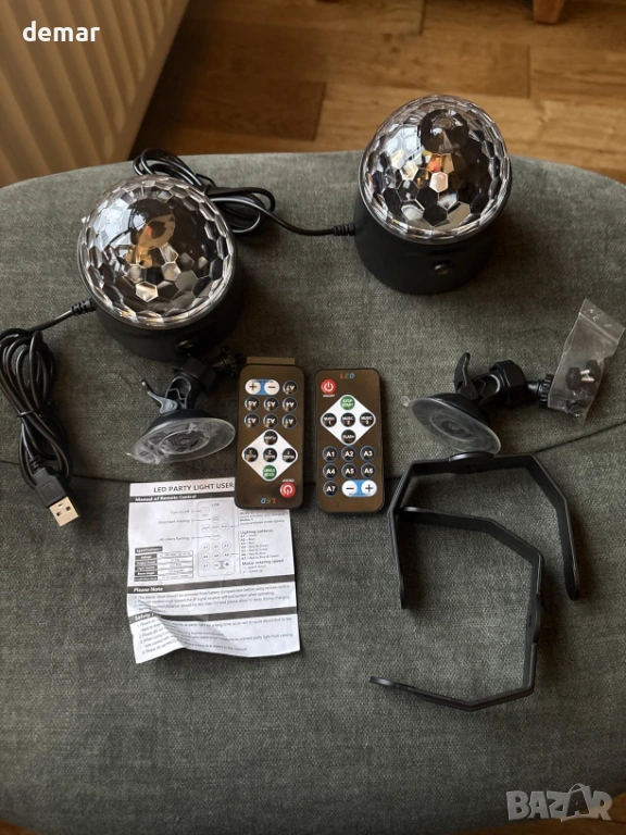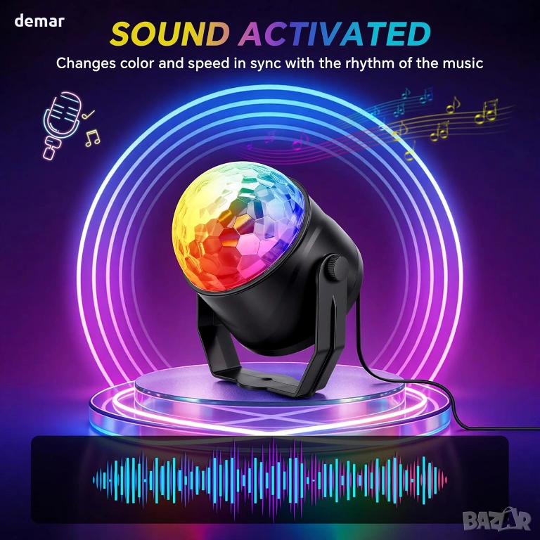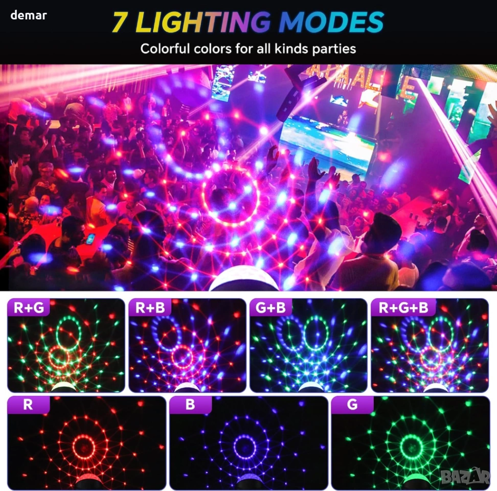 RGB диско светлина, 360° въртяща се диско топка със звуково активиране и дистанционно, 2 броя