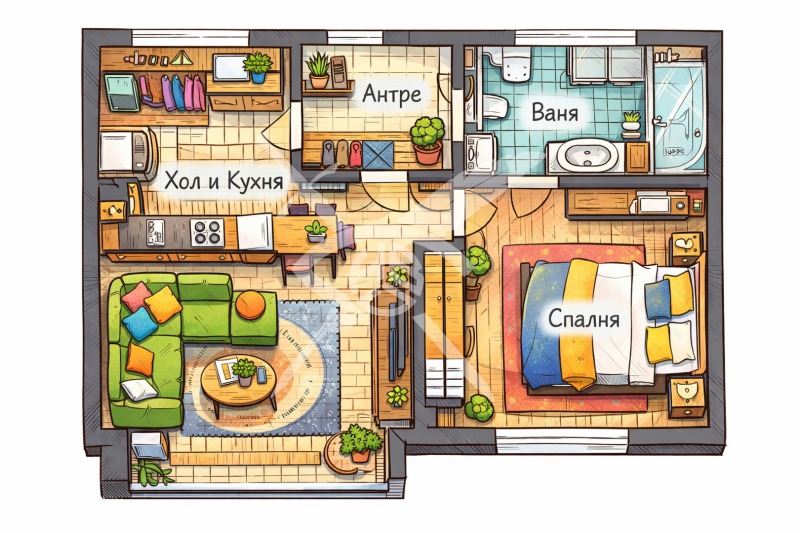 РАЗПРЕДЕЛЕНИЕ: Жилището разполага с площ от 70 кв.м., разпределена във входно антре, дневна с кухненска част, спалня и баня с тоалетна.