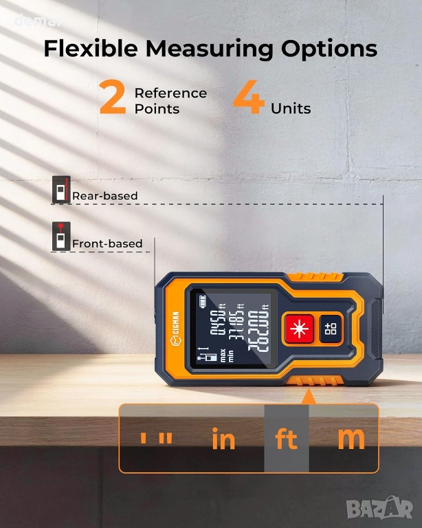 Този компактен лазерен далекомер осигурява бързи и точни измервания в една посока до 80 м и поддържа изчисления на дължина, площ, обем, площ на стена и индиректни питагорови теореми, с лесно превключване между шест мерни единици. Лекият му дизайн с джобни размери позволява удобна работа с една ръка, докато режимите на предна и задна референтна връзка подобряват точността при работа в ъгли или тесни пространства. Вградената акумулаторна литиева батерия с USB-C зареждане премахва нуждата от батерии за еднократна употреба, което го прави практичен и надежден инструмент за ремонти, геодезия, работа по оформлението и ежедневни „Направи си сам“ задачи.