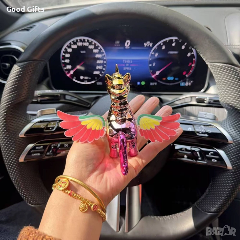 Декоративната фигурка „Летящ еднорог“ е стилен и ефектен аксесоар за интериора и екстериора на автомобила. Изработена от висококачествен материал с гланцово покритие, тя придава уникален и цветен акцент на таблото, централната конзола или друга равна повърхност в купето.
