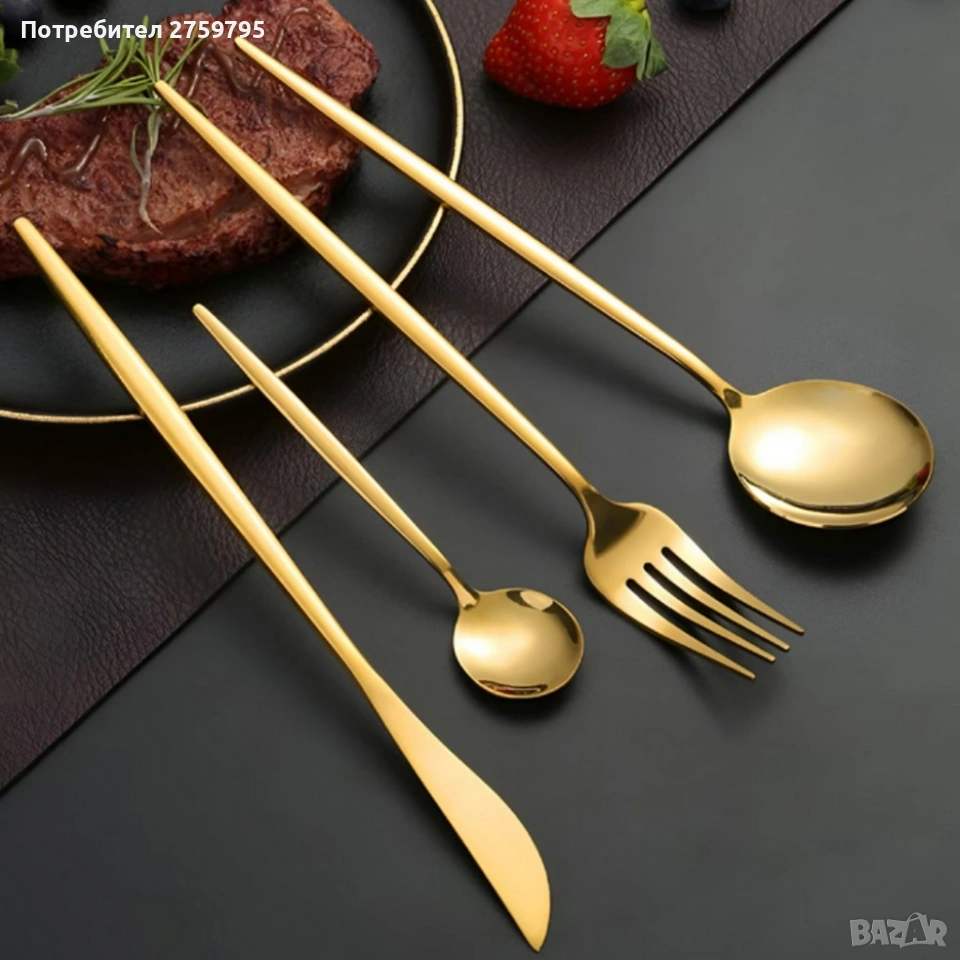 Комплект прибори за хранене в златист цвят от 24 части с луксозен дизайн и магнитна кутия. → Обява 53430250