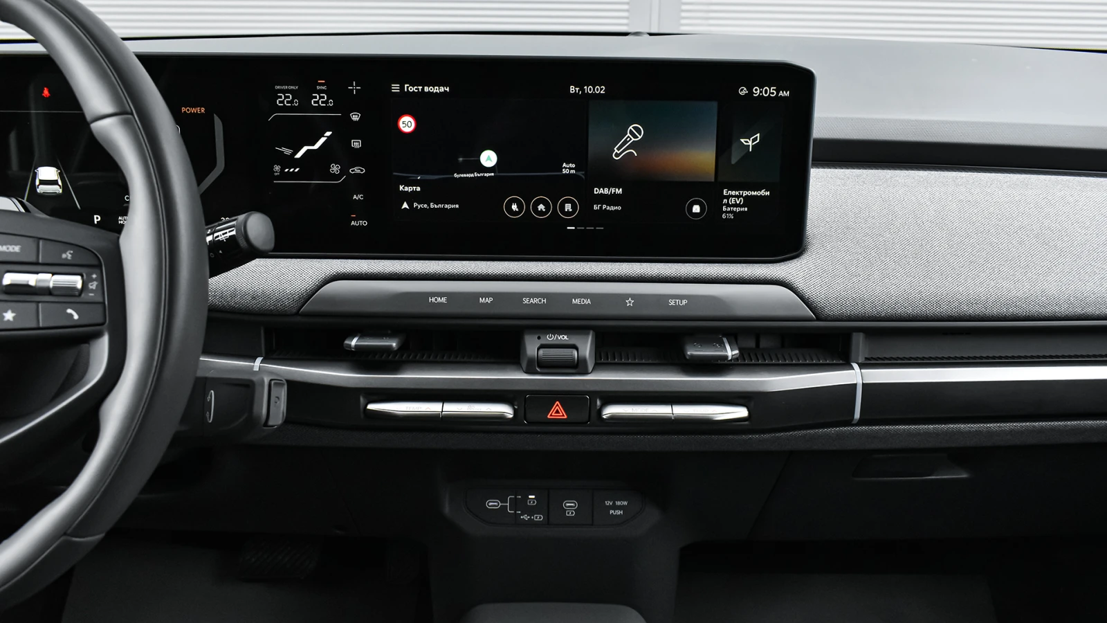 Автосвят ООД - официален представител на Opel и Mazda, предлага на Вашето внимание проверен автомобил KIA EV3 AIR 81. 4 kWh Long Range Предимства: - гаранция: до 7 години / до 150 000 км, според предписанията на завода производител, описани в сервизната книжка; - безплатна пътна помощ за Р България в рамките на гаранцията; - напълно обслужен. Допълнителни услуги: - лизинг; - сътрудничество при регистрация; - възможност за обратно изкупуване; - посредничество при застраховане; - посредничество при завеждане на щети при застрахователя. Пробег с едно зареждане на батерията 605 км. (WLTP) Среден разход на електрическа енергия 16. 2 кВтч/100 км. (WLTP) Брутен капацитет на батерията 81. 4 kWh Външен цвят Shale Grey металик Предна маска на автомобила с отличаващ " Tiger face" дизайн 17-инчови двуцветни алуминиеви джанти с гуми 215/60 R17 Основни фарове с вертикални, индиректни LED светлини LED дневни светлини LED габаритни светлини със " Star map" дизайн Задни стоп светлини конвенционални LED задни светлини за мъгла Ел. управляеми, отопляеми огледала с вградени мигачи Автоматични предни ръкохватки с " Pop-up" функция Акустично челно стъкло с редуциращо шума покритие " Privacy Glass" затъмнени задни стъкла след B-колоната Радиаторна решетка в цвета на купето Декоративна лайсна на предната броня в сребрист цвят Странични прагове в черен цвят Сребристи декоративни лайсни в долната част на вратите Заден спойлер с LED трети стоп Предни чистачки с регулируем интервал Подгряване на задното стъкло с таймер Соларни стъкла с увеличена UV и температурна защита Надлъжни рейки на покрива Климатизация с термопомпа енерго-ефективна климатична система " Full Digital cockpit" 12, 3" +12, 3" LCD инструментален панел 2-лъчев волан с регулиране по височина и дълбочина E-SHIFT - " Shift-by-wire" селектор за предавките Кожен пакет: волан и подлакътник в " Еко" кожа Кожен салон: седалки и подлакътници в " Eko" кожа 60: 40 делими, падащи задни облегалки за 3 пасажера Джобове за документи на облегалките на предните седалки Заден централен подлакътник с поставки за чаши Таванна конзола отпред с LED спот светлини 2 x LED светлини за осветление на интериора за 2-ри ред Централна конзола с метален акцент Отделение за допълнителен багаж под централната конзола Сенници за предните места с изтегляне и вградени огледа Поставки за чаши на средната конзола, отворен тип LED осветление за багажното отделение Кора за багажното отделение Отделение за предмети под кората на багажника Куки за укрепване на багаж в багажника Щора за багажното отделение Двузонов климатроник отпред Въздуховоди за задните места, разположени на средната конзола " Auto De-Foger" система против замъгляване на челното стъкло " ЕРВ" електрическа ръчна спирачка с " Auto-hold" функция Мултифункционален волан с аудио управление Advanced " Smart Cruise Control" със " Stop&Go" функция MSLA (Manual Speed Limit Assist) оганичител на скоростта " Bluetooth" система за мобилен телефон с гласови команди " Drive mode select" настройка на режима на шофиране " Smart key" система за безключов достъп със " Start/Stop" бутон Електрически стъкла предни и задни (предните с Auto функция) Регулиране на седалката на водача по височина Подгряване на предните седалки Подгряване на волана 12V изводи отпред на централната конзола USB charger 2 USB-C чарджъра разположени в предните облегалки Дигитален часовник V2L (Vehicle to Load) и V2V (Vehicle to Vehicle) ел. система: Двупосочен трансформатор позволяващ споделянето на енергия. Допълнителе