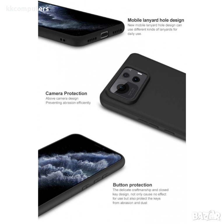 Защита на камерата и екрана с повдигнати ръбове: Повдигнатите ръбове около камерния модул и екрана предпазват лещите и дисплея от драскотини при поставяне на телефона.