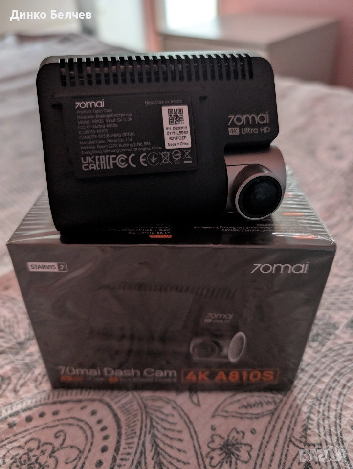 Продавам висок клас видеорегистратор (камера за автомобил) 70mai A810. Това е флагманският модел на марката, който предлага безкомпромисно 4K качество на заснемане, дори и при пълна тъмнина. Устройството е незаменим помощник при пътуване и осигурява доказателства при инциденти на пътя. Основни характеристики: Сензор: Най-новият Sony STARVIS 2 IMX678 (високотехнологичен сензор за екстремно детайлни нощни кадри). Резолюция: Истинско 4K UHD (3840 \times 2160 пиксела). Образът е изключително детайлен – регистрационните номера се четат лесно. HDR (High Dynamic Range): Технология за балансиране на светлината, която предотвратява заслепяването от фарове през нощта. AI засичане на движение: Камерата автоматично започва запис, ако засече подозрителна активност около колата (изисква Hardwire Kit - захранващ кабел за директно свързване към акумулатора). Вграден GPS: Записва скоростта и точните координати на всяко видео. ADAS (Advanced Driver Assistance Systems): Система за сигурност, която те предупреждава при напускане на лентата или при риск от челен сблъсък. Управление чрез приложение: Лесно прехвърляне на записи на телефона чрез Wi-Fi. Състояние: Устройството е използвано много малко време. Пълен комплект с оригинална кутия, захранващ кабел за запалка и стойка за стъкло + хардуер кит за паркинг режим. Лещи без надрасквания, работи перфектно.