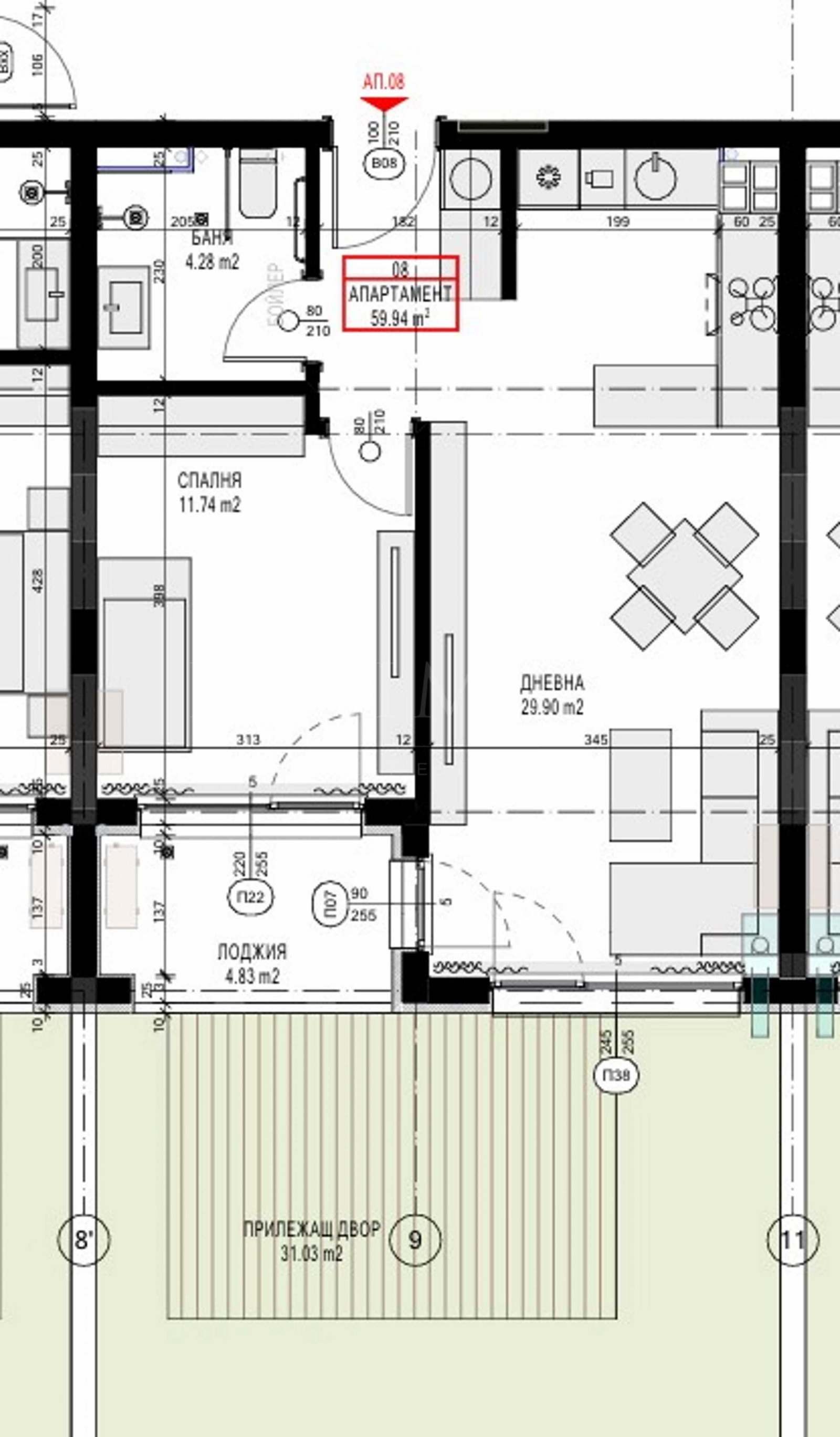 Апартамент 8 е разположен на 1-ви етаж в сградата и има застроена площ от 59.94 кв.м, с разпределение: антре, баня/тоалетна, светла дневна с кухня и трапезария, комфортна спалня, тераса тип лоджия с излаз от двете стаи. Жилището е с включен в цената прилежащ двор - 31,03 кв.м и склад - 2,79 кв.м.