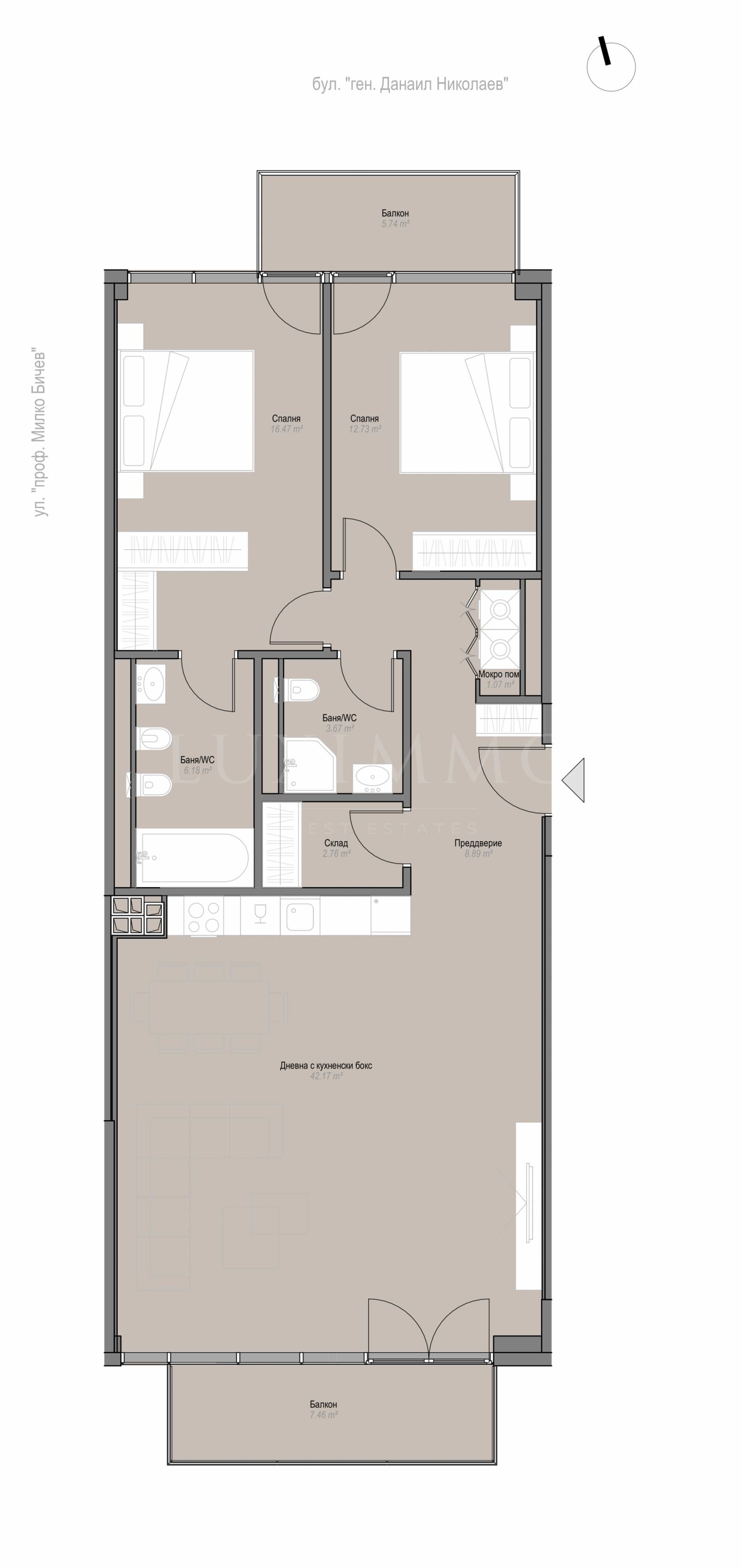 Имотът е ситуиран във вход 'Д', намиращ се на етаж 10 с обща площ от 155.42 м2 и следното разпределение: дневна с трапезария и кухненски бокс, 2 бани с WC, две спални, входно преддверие, тераса и складово помещение..