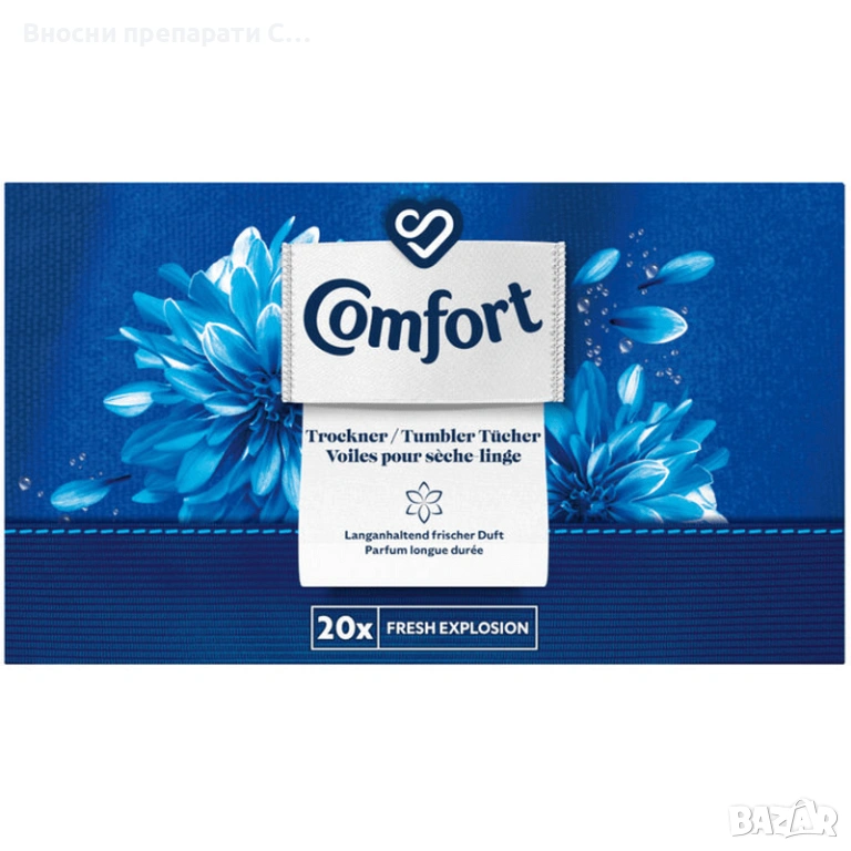 Кърпичките Fresh Explosion са идеалното решение за тези, които искат да се насладят на свежест и приятен аромат, когато използват сушилнята. Comfort е идеалният начин да освежите дрехи и текстил, като елиминирате неприятните миризми и им придадете ново качество. Опаковката съдържа 20 кърпички, които са лесни за употреба и ефективни.