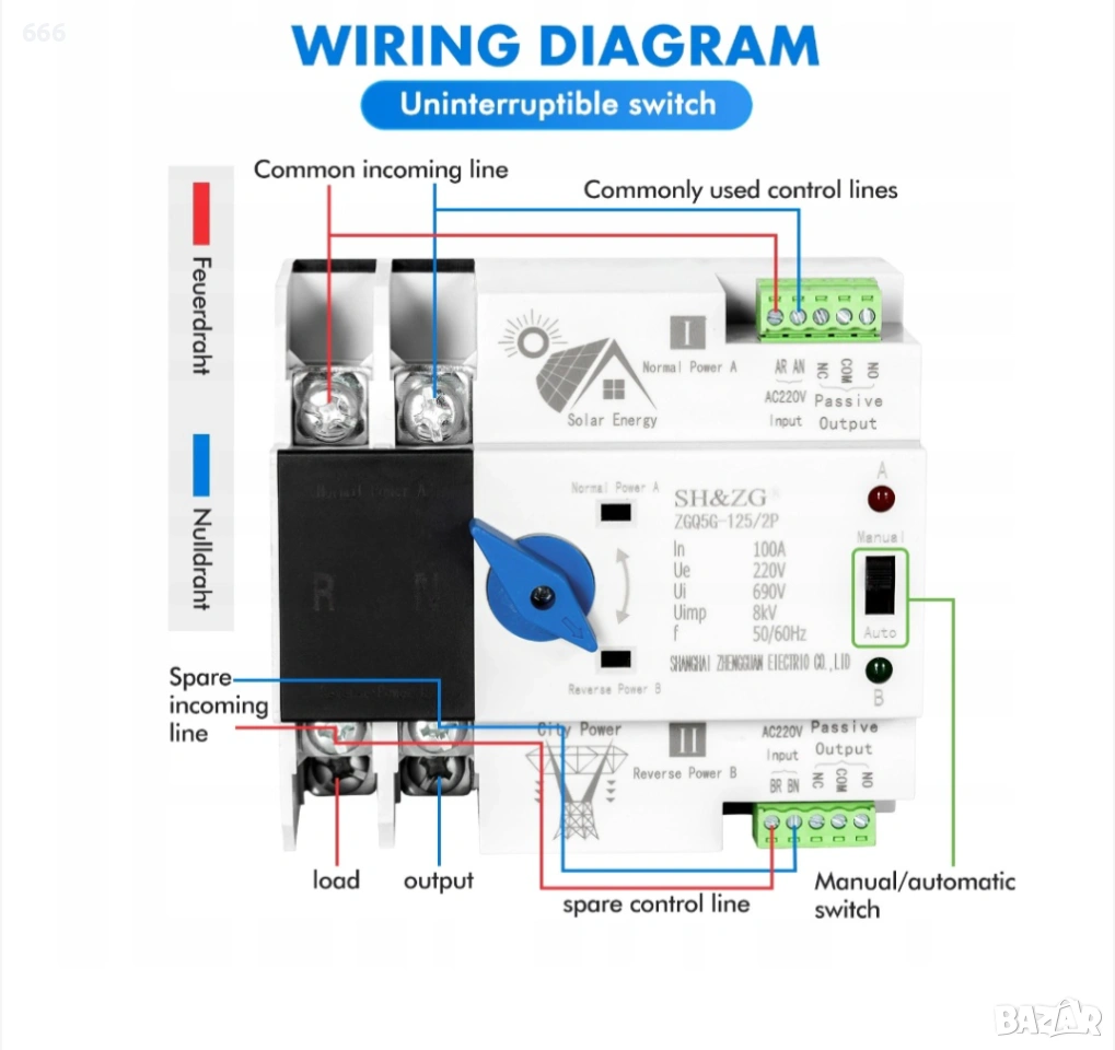 1. Обхват на приложение: Този продукт е фотоволтаична версия на автоматичния превключвател за прехвърляне с двойно захранване. За разлика от мрежовите продукти, които могат да бъдат свързани само към мрежата или генератори, този продукт може да бъде свързан към UV лампа, инвертор, слънчева енергия, фотоволтаични клетки като основен източник на захранване и към мрежата или генератор като резервен източник на захранване. Продуктът е сертифициран по CE и може да се използва без притеснения.