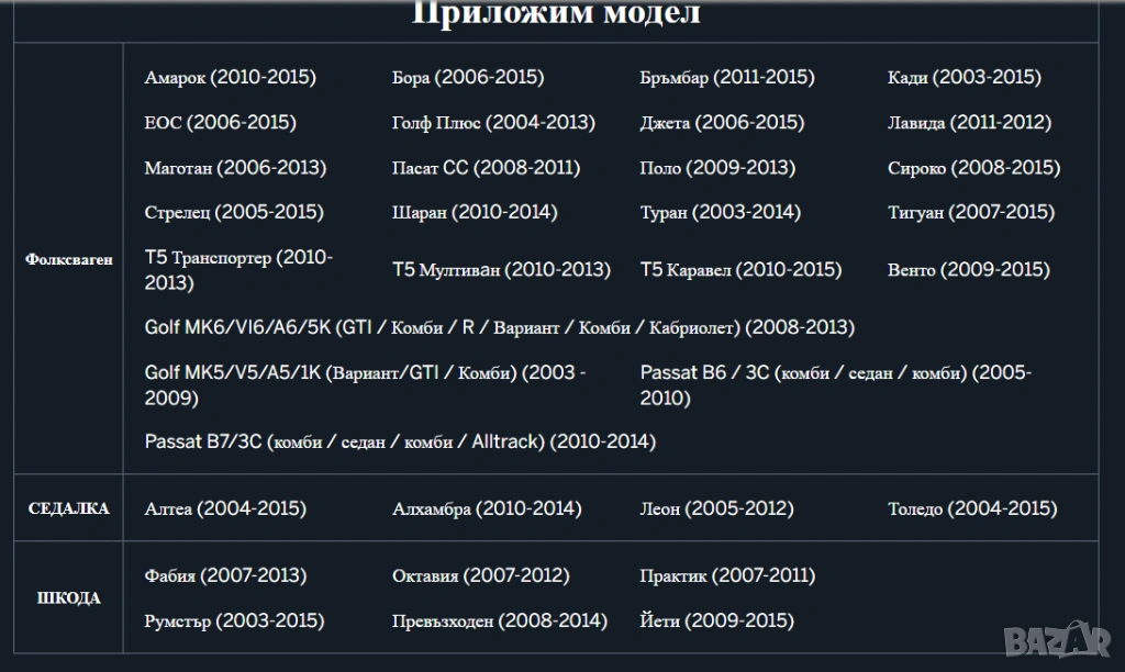 Устройството е проектирано за директна подмяна ("plug and play") на оригиналните радио системи в модели като VW Golf (MK5/MK6), Passat, Jetta, Tiguan, както и съответните модели на SEAT и Skoda.