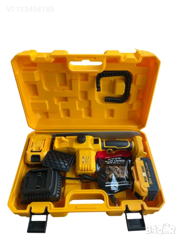 акумулаторна резачка с резервоар с автоматично смазване на веригата KraftMaster , маслен филтър и дисплей комплектована с: Акумулаторна батерия 36V, 10Ah: 2бр
