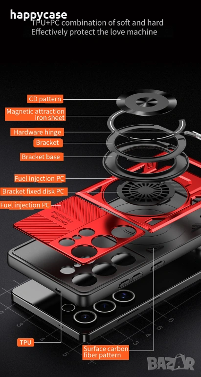 4. Голям алуминиев пръстен отзад на гърба. Служи като стойка на която телефона може да се обляга в хоризонтално и вертикално положение. Също пръстена може да се използва и като finger holder за сигурно захващане на телефона с един пръст. За по-голямо удобство, пръстена може да се завърта на 360 градуса.