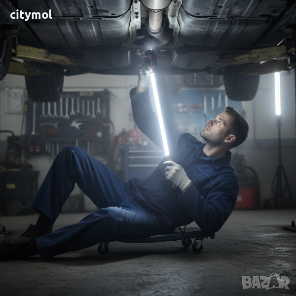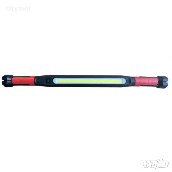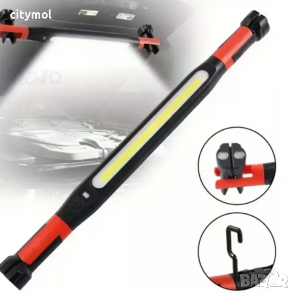 Дизайнът на лампата е съобразен с практичността: тънко, продълговато тяло с широк COB панел за равномерно осветление и гумени акценти за здрав захват. Краищата разполагат с магнитни основи и въртящи се механизми, което позволява фиксиране върху метални части на автомобила или стоманени конструкции и насочване на светлината точно там, където трябва. Вградените куки се прибират и позволяват лесно закачане на лампата в различни позиции. Цветовото решение и устойчивите материали подсилват професионалния характер и издръжливостта при интензивна употреба.