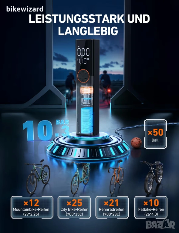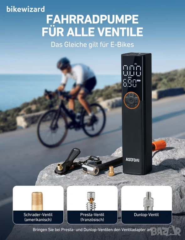 Несравнима гъвкавост: Съвместима с вентили Presta, Schrader и Dunlop, тази помпа осигурява до 150 PSI - идеална за повечето велосипеди, електрически велосипеди, мотоциклети и спортни топки. Вградена LED светлина с три режима (постоянно, бавно мигане).