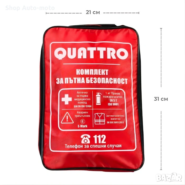 Аварийният комплект е пълно и надеждно решение за пътна безопасност, предназначено за всички видове моторни превозни средства. Комплектът отговаря на действащите нормативни изисквания и е подходящ както за крайни клиенти, така и за търговия на едро.