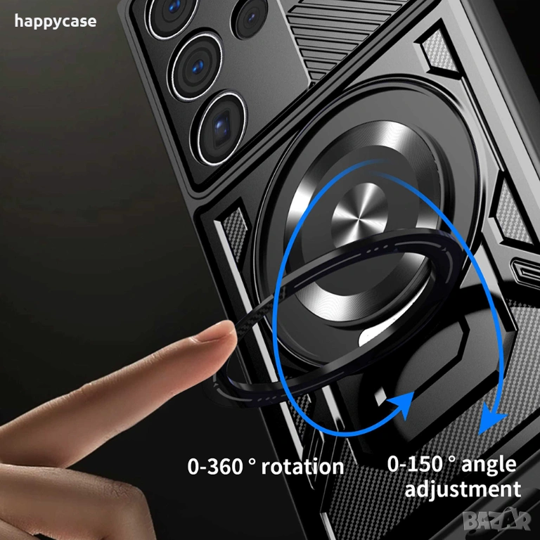 4. Голям алуминиев пръстен отзад на гърба. Служи като стойка на която телефона може да се обляга в хоризонтално и вертикално положение. Също пръстена може да се използва и като finger holder за сигурно захващане на телефона с един пръст. За по-голямо удобство, пръстена може да се завърта на 360 градуса.