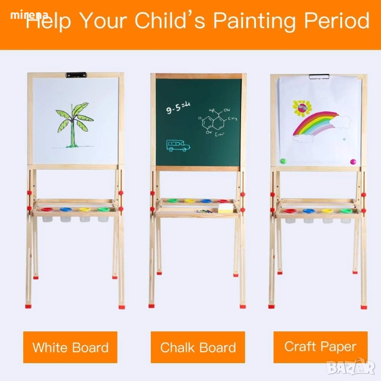 Много забавление: Детски статив. Включва магнитни букви и комплект за математика, 4 чаши за рисуване, 6 магически фигурки, тебешири и маркер за бяла дъска. Позволява на децата да създават изкуство с боя, тебешир, маркер или да играят математически или буквени игри с родителите си.