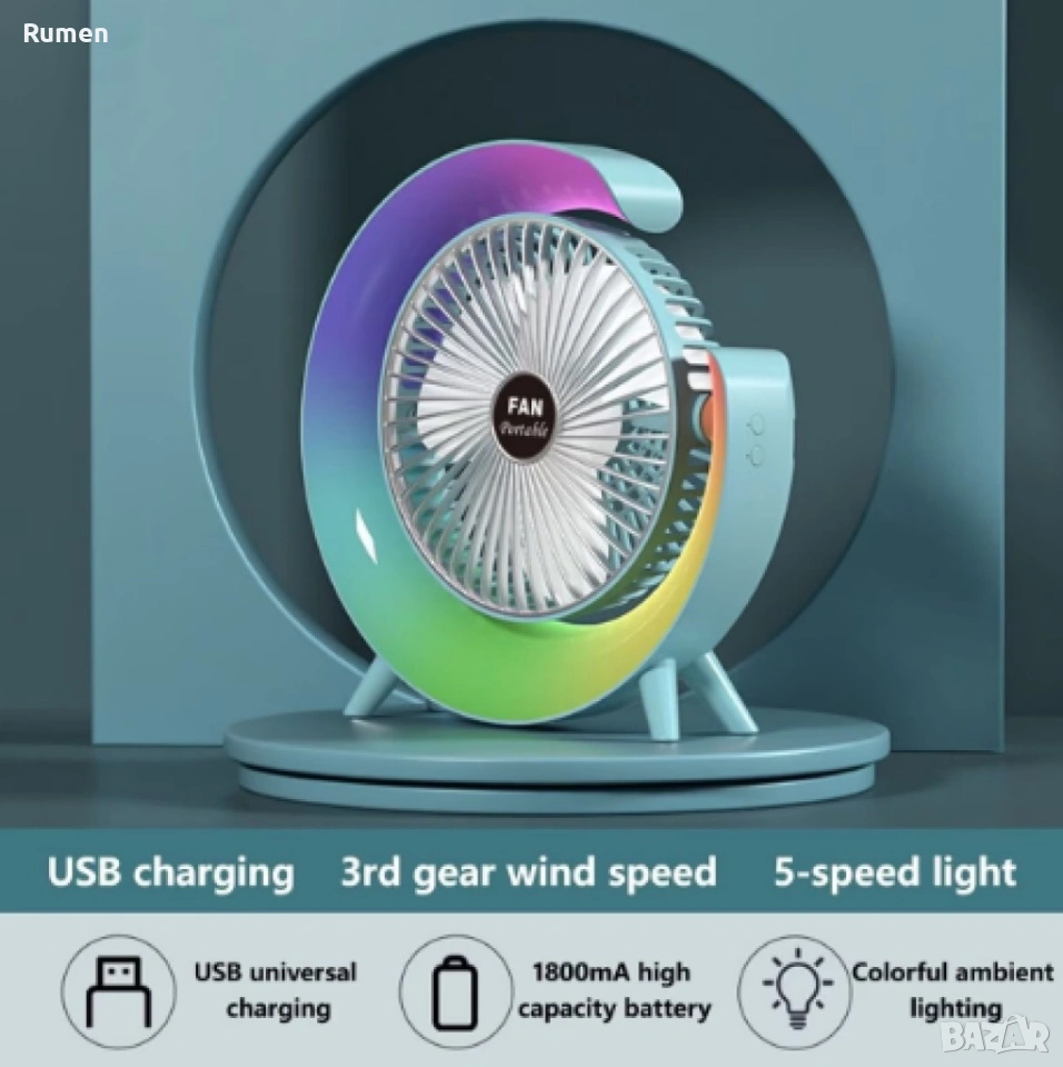 Работи безшумно, като предлага прохлада без да пречи на работата или почивката. Изработен от здрав и издръжлив материал, лесен за почистване. Подходящ за настолен компютър, офис, кола или къмпинг. Модерен, практичен и комфортен, нашият многофункционален вентилатор с осветление и циркулация е идеалният партньор за създаване на приятна и енергична среда във всяка стая или дейност. Изберете качество и комфорт!