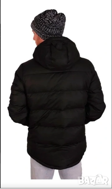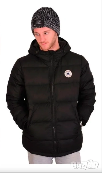 мъжко пухено яке с качулка от марката Converse. Якето е в черен цвят и се характеризира с емблематичното кръгло лого „Converse All Star“ на гърдите.
