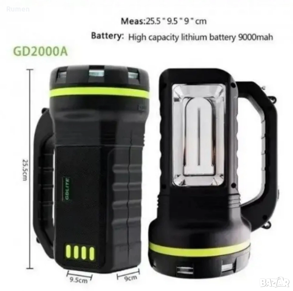 Капацитет на батерията: 9000 mAh; Входно напрежение: 5 V DC, 220 V AC Изходно напрежение: 3 изхода 6 V, 1 изход USB: 5 V, 0,5 A; Време за зареждане: 10-15 часа от мрежата, 12-16 часа от слънчева батерия; Индикатор на нивото на заряда на батерията; Аварийна LED лампа; Слънчева батерия; Размери: 22,5 x 9,5 x 9 см; Фенер: Фенерът е снабден с мощна LED лампа, която осигурява ярко и равномерно осветление. Има 3 режима на осветление: силно, слабо и мигащо; Слънчев панел: Слънчевият панел зарежда батерията на станцията, така че можете да използвате фенера дори когато няма електричество; 3 лампи: Трите лампи могат да се използват за осветление на палатки, каравани или други помещения;