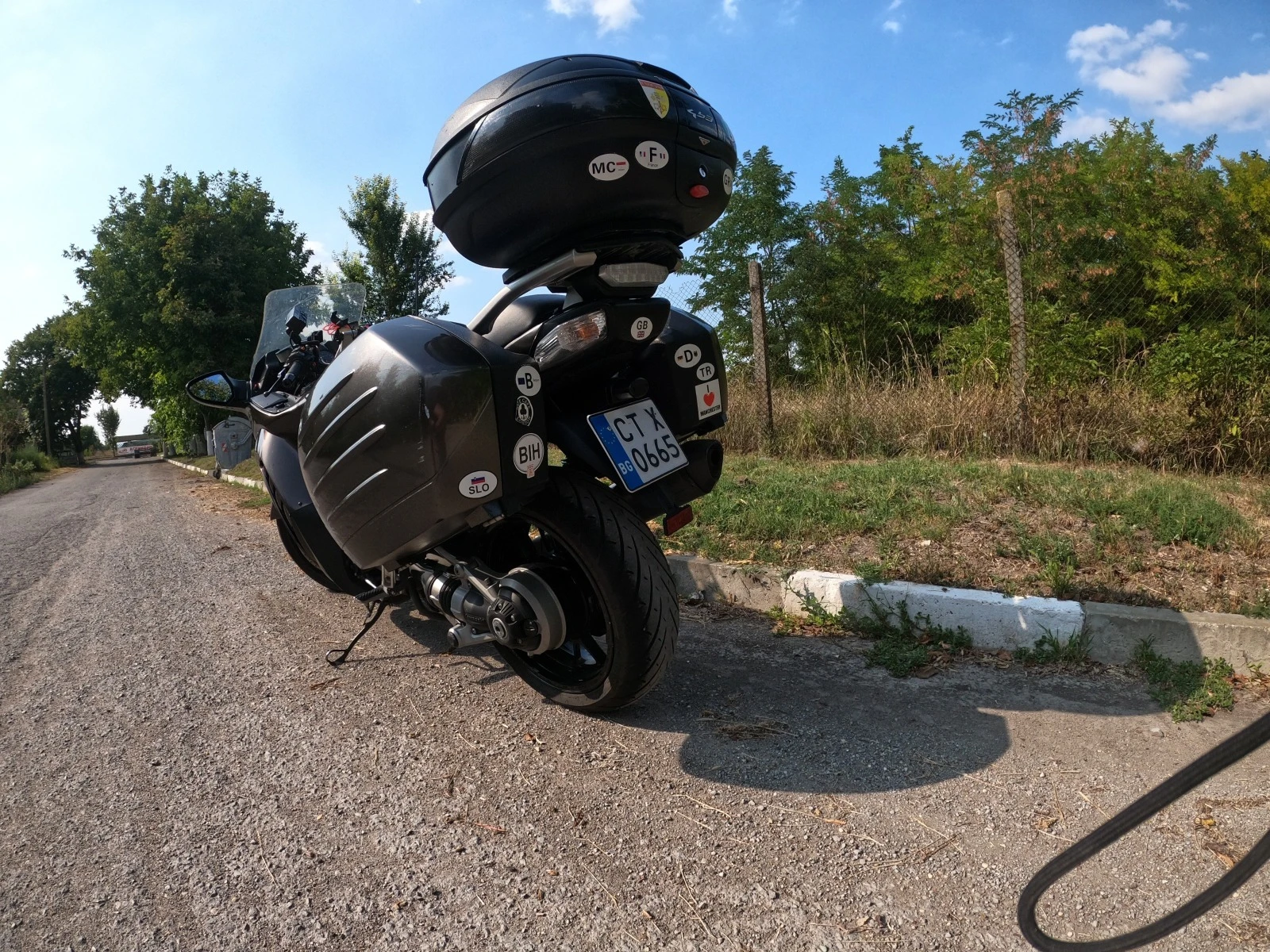 Гледам, че останалите мотори от същия модел тук са на някакви смешни километри, въпреки годините им. Явно предните собственици са използвали 300 кг мотор, за да ходят на кафе с тях или някоя баба ги е държала в гараж хахаха. Няма съмнение, че са с пренавити километражи. Поне този е на реалистични километри. За 3 седмици пътешествие до Лисабон и обратно минахме 10 000 км. Може да си направите сметката за тия на по 30 000 км дали наистина са на толкова Сега за състоянието му и екстрите - K&N филтър, brembo дискове на предните спирачки, гуми на под 2000 км, подгряване на ръкохватките, ABS + Traction Control, генерация Аkrapovic, оригиналната седалка + допълнителна, която наскоро беше изградена наново и претапицирана, подвижна слюда, сензори за налягане в гумите, безключово палене. Откакто аз го карам (около 50 000 км) е поддържан само на едно място в София, сервиз който препоръчвам с 2 ръце, където могат да дадат информация за мотора. Има вграден интерком, който се захранва от мотора, поддържа разговор с пасажера с отлично отстраняване на външни шумове, свързване на 2 телефона, навигация, музика и радиостанция. Интеркома работи перфектно и се чува отлично без значение от скоростта. Има забележки по боята, защото както казах мотора е тежък и се е случвало да го изпускам от място. Никога не е падано с него. Само през последната година мотора се съхранява на открито, но на сянка през останалото време винаги е бил в гараж.