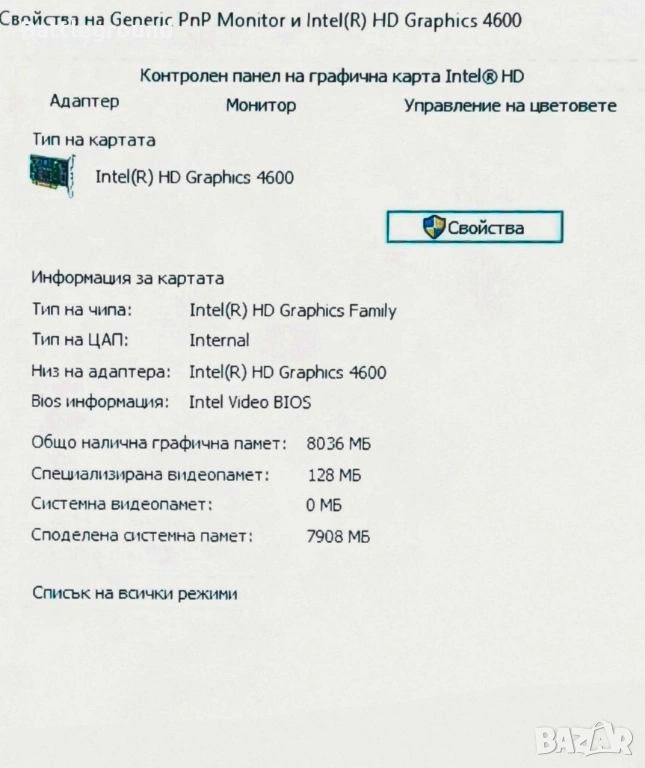 Видео карта: Intel HD Graphics 4600M 8GB споделена памет With Turbo Boost 1.30Ghz