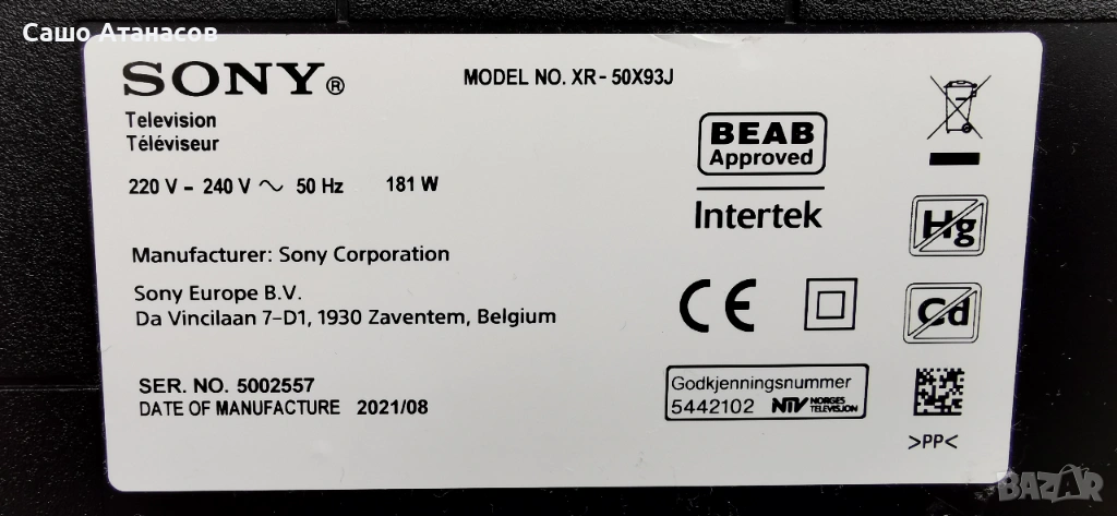 SONY XR-50X93J със счупена матрица ,AC21202 ,1-010-115-51 ,1-009-562-11 ,50T39 C05 CTRL ,DHUR-SY63