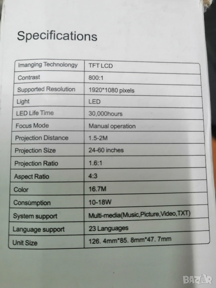 - Размер на проекция: Между 20 и 100 см, с разстояние на прожектиране 0,6-3м.