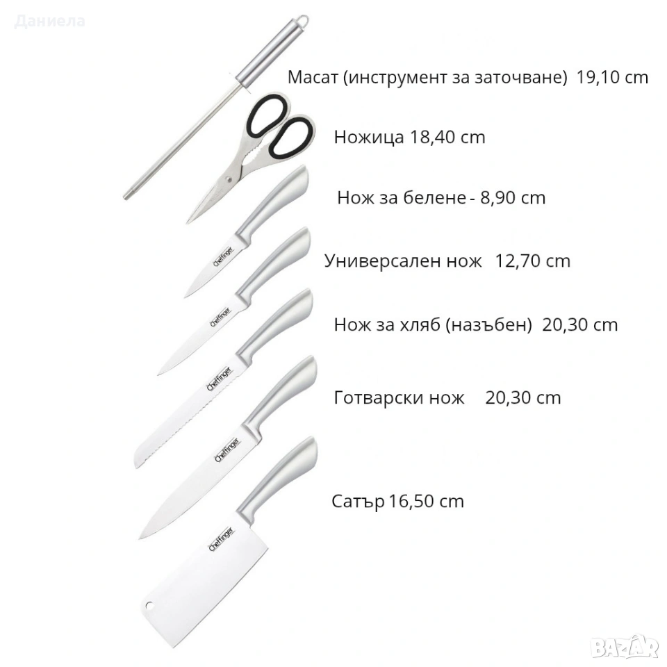 Тип продукт: Комплект ножове 8 части - 5 ножа, ножица, точило и стойка; Материал: неръждаема стомана (ножове), акрил (стойка); Размери: Точилка (масат): 19.10 см; Ножица: 18.40 см; Нож за белене: 8.90 см; Универсален нож: 12.70 см; Нож за хляб: 20.30 см; Готварски нож: 20.30 см; Сатър: 16.50 см; Температурна устойчивост: подходящи за стандартна кухненска среда; Поддръжка / почистване: ръчно измиване, лесно почистване; Допълнителни функции: 360° въртяща се основа.