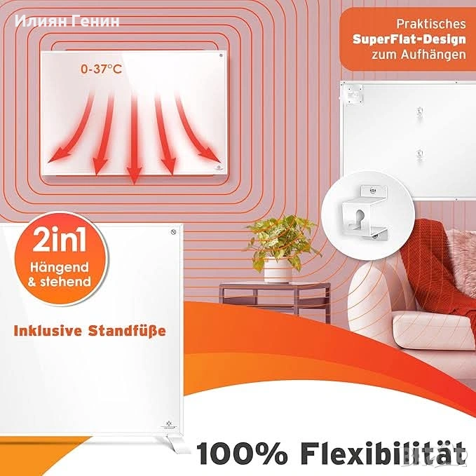 Висококачествена отоплителна система: висококачественото производство гарантира освен функционалността, и издръжлива и висококачествена отоплителна система. Различни пластини, които се държат от монтажна плоча на гърба и предната плоча, осигуряват генериране на топлина чрез инфрачервените лъчи. Изградена от плоча за идеална изолация и инфрачервен нагревателен елемент, вие получавате гарантирано възможно най-добро генериране на топлина.