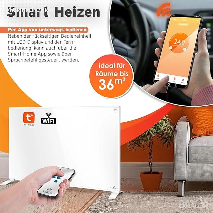 Функция за приложение, дистанционно управление и таймер: благодарение на включеното дистанционно управление за термостата, вградената функция за приложение TUYA или дори гласовата функция, съвместима с Alexa, Google Assistant и Siri, можете лесно да настроите желаната температура от разстояние. Нашият радиатор впечатлява и с функцията си за таймер.
