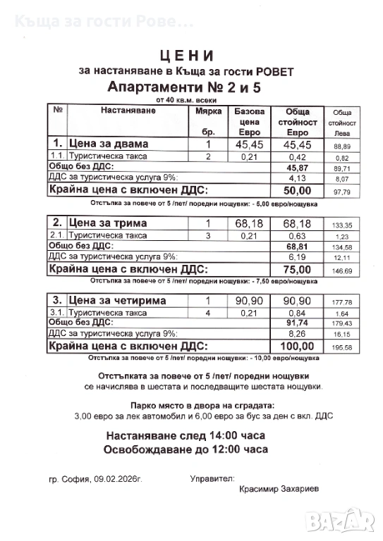 0,21 евро и ДДС за туристическа услуга в размер на 9%. Нощувките и почивките се
