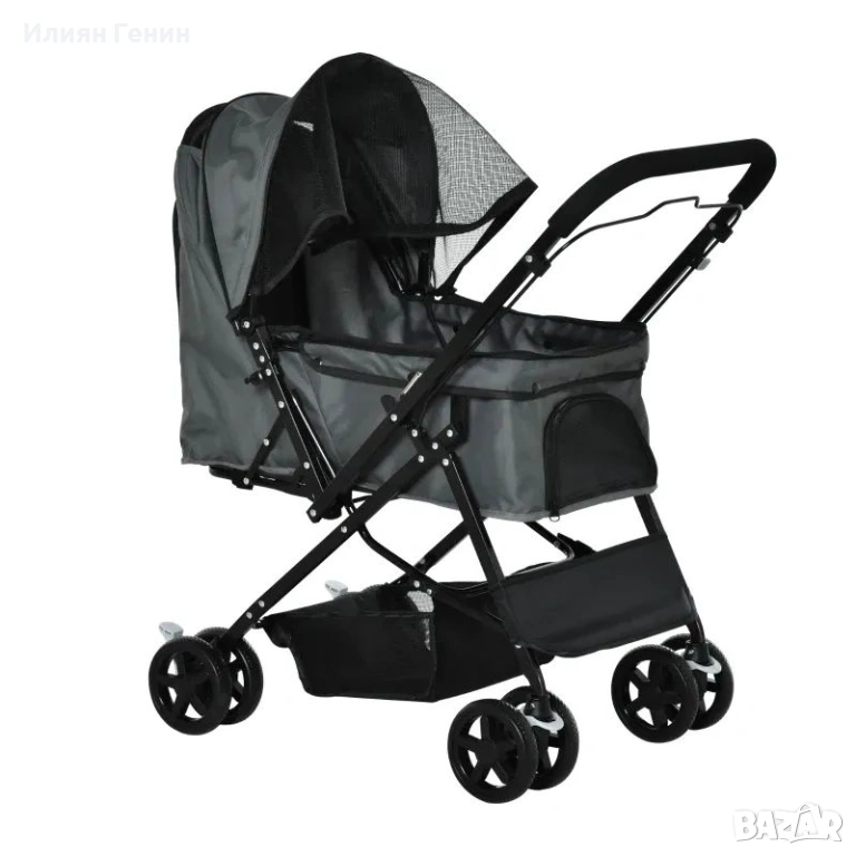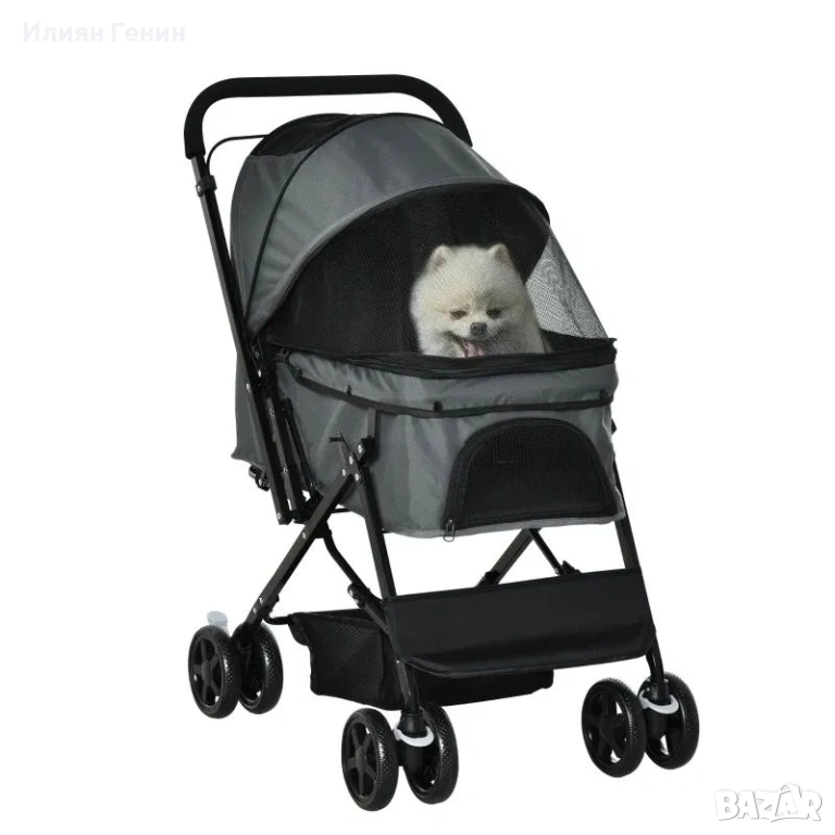 Кучешка количка PawHut, Кучешка количка до 10 кг, Сгъваема, Мрежест прозорец, Кош за съхранение, Регулируем сенник, Тъмносива, 76,5 x 52 x 95см - 125.00 €.