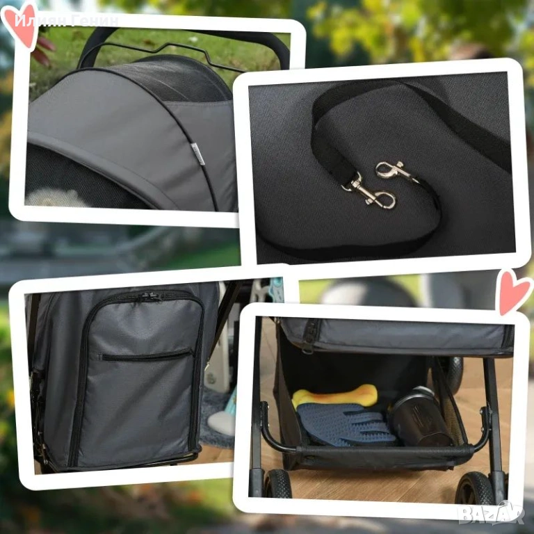 Голяма кошница: Много място за почивка на вашия домашен любимец, защитена от регулируем сенник. Количката за кучета има мрежести прозорци за добра вентилация. Врата с цип осигурява лесен достъп, а две предпазни каишки осигуряват допълнителна сигурност.
