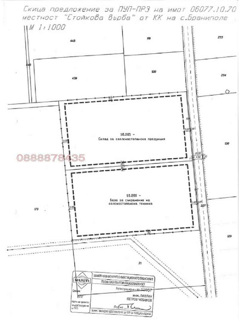 Частно лице предлага парцел в Южна индустриална зона. Имотът е 6846кв.м, със сменен статут и проект за База за съхранение на селскостопанска техника. Проектът включва присъединяване към близък трафопост и изграждане на път, свързващ имота с oколовръстното шосе Асеновград-София, което в момента, преди разширяването му е на около 400м. Първите 120м вече са асфалтирани. Има и разрешение за изграждане на сонда