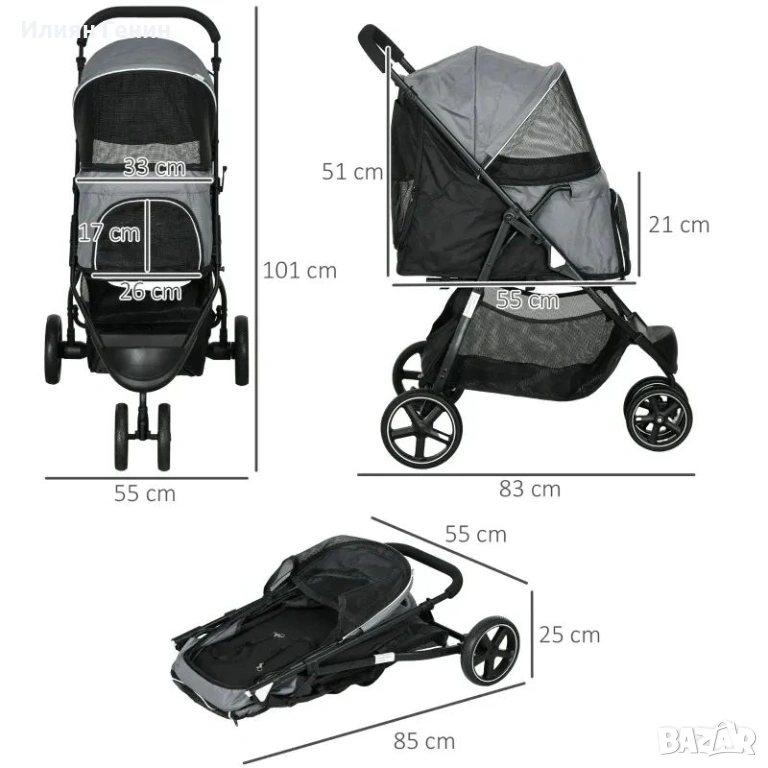 Размери на количката за кучета: Общи размери: 83Д x 55Ш x 101Всм. Размери на основното тяло: 55Д x 35Ш x 51/21Всм (с/без сенник). Размери в сгънато състояние: 85Д x 55Ш x 25Всм. Максимално натоварване: 15 кг. Подходяща за миниатюрни и малки кучета до 10 кг и максимална дължина на тялото 35 см. Необходим е монтаж.
