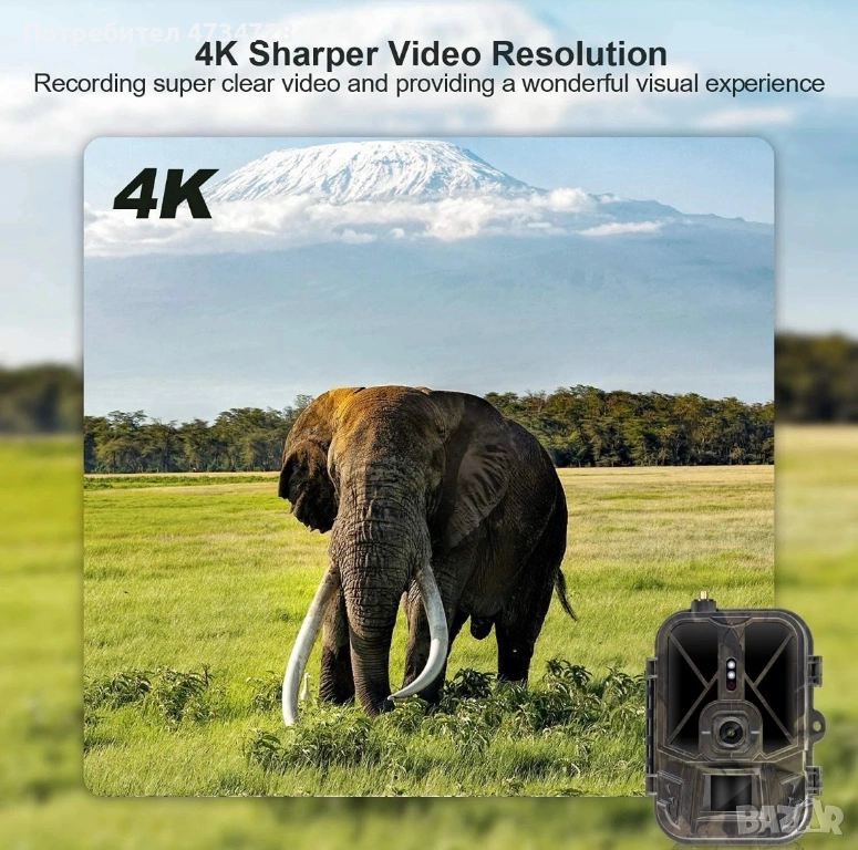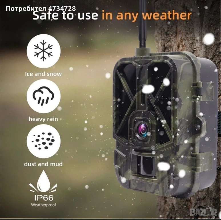 ловна камера, фотокапан. Камерата работи с приложение на SuntekCam. Когато вече е вкарана в приложението камерата започва да изпраща снимки и видео при засичане на движение. Този модел камери се отличава с това, че може от телефона да се гледа видео в реално време. Освен това при засичане на обект изпраща известие със снимка или видео /зависи от настройката която сте задали/. Камерата е снабдена с вградена презареждаща литиевойонна батерия 10000mah. Много лесни и бързи настройки. Настройките и пускането на камерата става за минута. Приложението е напълно безплатно за Аndroid и IOS телефони. Когато вече вкарате камерата в приложението на телефона може да правите всякакви видове настройки дори камерата да не е при вас. Също така може да чистите картата с памет от приложението без да се налага да ходите до камерата. Може да се наблюдава от неограничен брой хора.