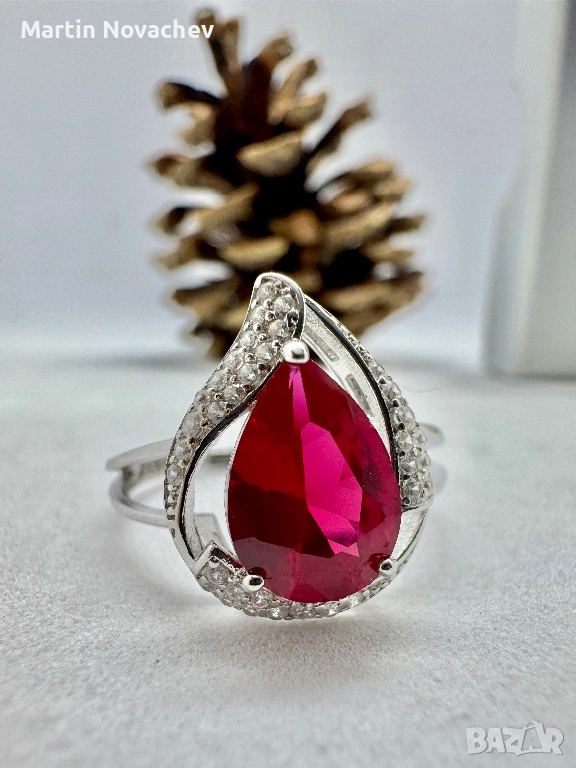 Елегантен и впечатляващ модел с голям фасетиран синтетичен рубин в наситен червен цвят, оформен в стилна капковидна форма. Камъкът е красиво подчертан от фини бели цирконии, които придават допълнителен блясък и луксозно излъчване.