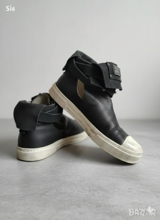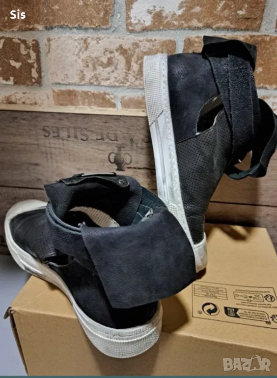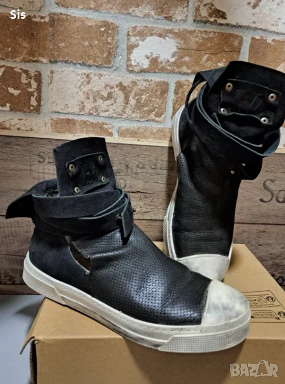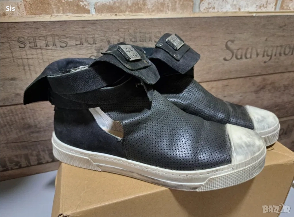 Не са носени , закопчават се със каишка,имат лек отвор . Езикът се обръща ,така че може да се носят и по двата начина. Имат актуално износен ефект ! Фабрично така са закупени.