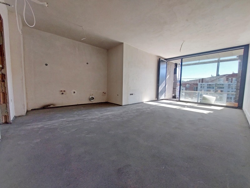 Просторна дневна с кухня от 26,8 кв.м. Помещението е просторно и слънчево с южно изложение и големи френски прозорци, осигуряващи много естествена светлина и прекрасна гледка.