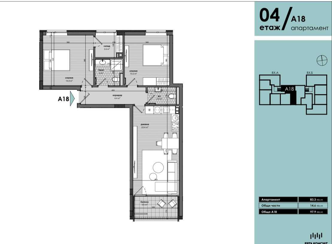 Обща площ: 97,9 кв.м.