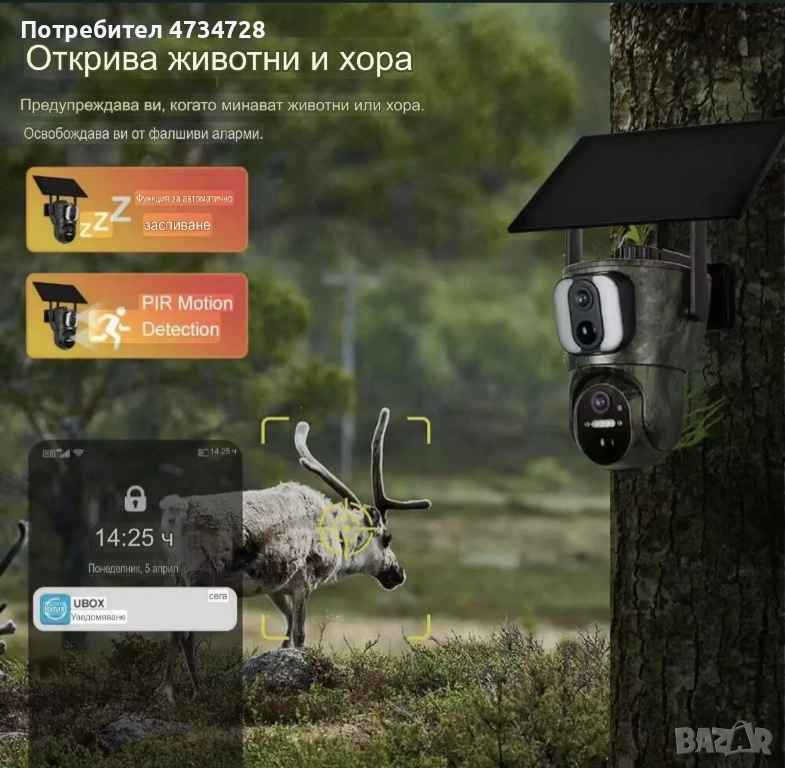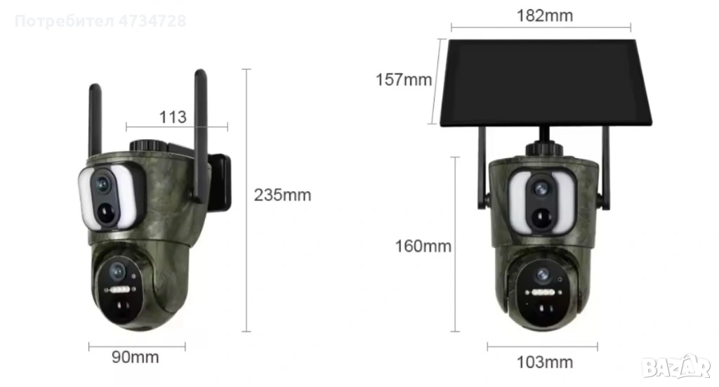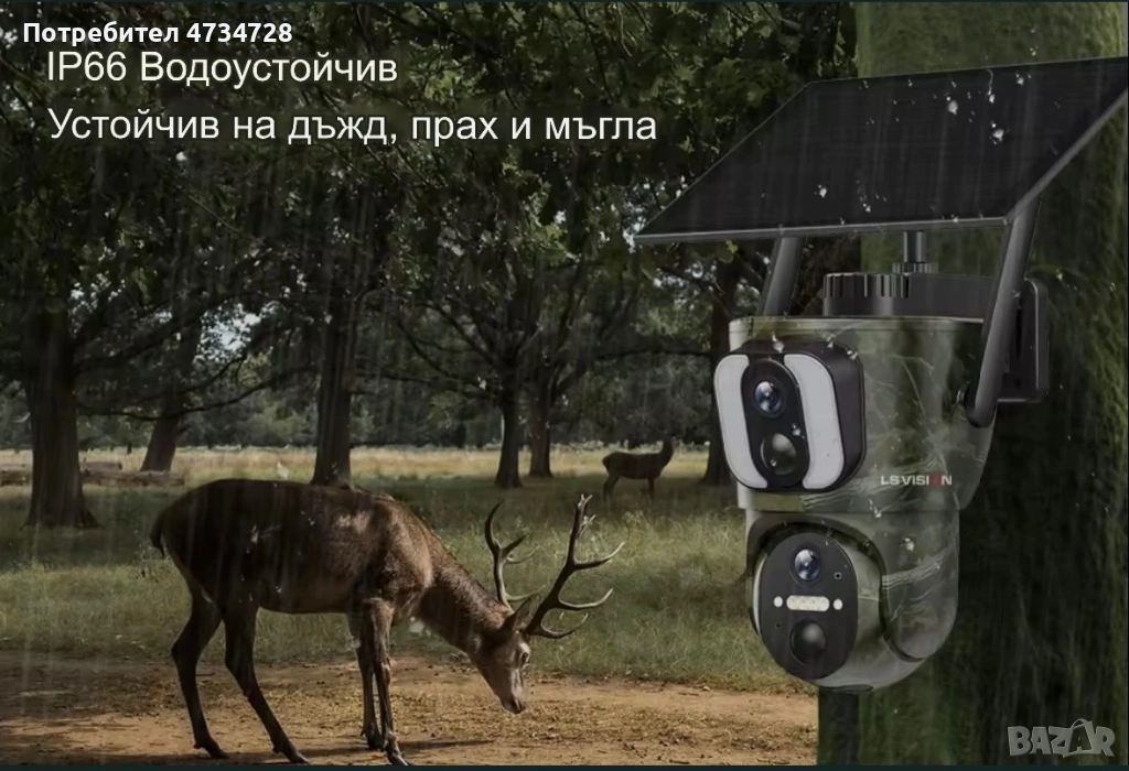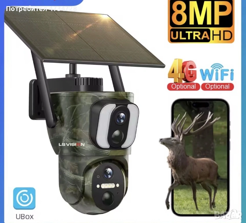 Ловна камера с двойна леща, горната леща е фиксирана, долната е въртяща на 355 градуса с накланяне на 100 градуса. 4K видео и 8mp камера. 6 вата соларен панел с 3 метра кабел. Вградена батерия в камерата 15000mAh. Работи с 4G сим карти. Приложение за гледане на живо и изпращане на известия при засичане на движение. Може да се зададе произволно време за активиране. IR разстояние 30 метра. Напълно водоустойчива.