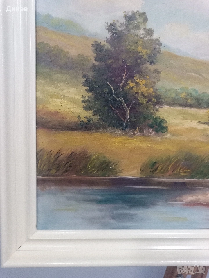 Продавам автентична маслена живопис върху платно със спокоен и идиличен летен сюжет. Картината изобразява пасторален пейзаж с брези, езеро и планински масив в далечината. Творбата има подчертан класически стил и носи духа на миналото. Основни детайли: Техника: Масло върху платно. Размери: 78 см дължина на 59 см височина (заедно с рамката). Автор: Картината е подписана в долния десен ъгъл (виж снимките). Сюжет: Планински пейзаж, черен път и брезови дървета – много успокояваща и хармонична композиция. Състояние: Платното: В отлично състояние за възрастта си. Няма разкъсвания, дупки или сериозни напуквания на боята. Цветовете са наситени и живи. Рамка: Картината се продава с дървена рамка Картината е подходяща както за ценители на старото изкуство, така и за декорация на домове, вили или офиси в класически стил. Доставка: Изпращам с Еконт или Спиди с опция "Преглед".