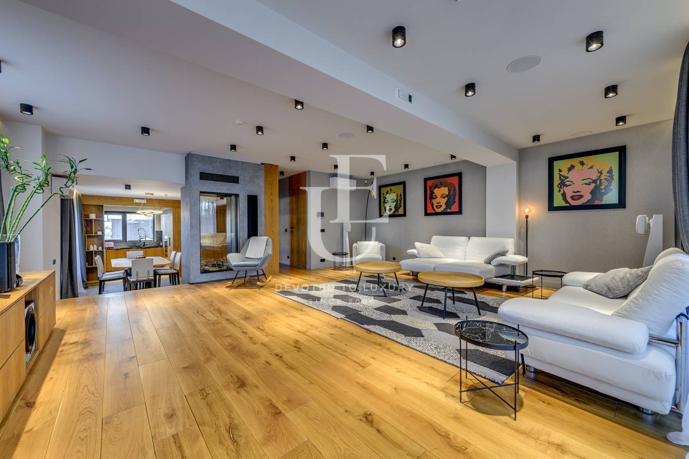 Къщата е близнак, южно ориентирана, с прекрасна гледка към планинанта. Предлага се напълно завършена с висококачествени материали, и луксозно обзаведена - мека мебел Rolf Benz, електроуреди Miele, мебели по дизайнерски проект от висококачествен МДФ.