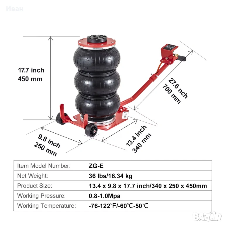 Пневматичен крик с дълги дръжки за коли VEVOR ,3 тона/6600 lbs. Тройна въздушна възглавница, шест стоманени тръби. Повдигане до 17.7 инча/450 мм, 3-5 сек бързо повдигане. Капацитет на натоварване 3 тона: С впечатляващ капацитет на натоварване от 3 тона, този въздушен крик е проектиран да поддържа широк спектър от домакински и търговски модели. От семейни коли и пикапи до микро коли и SUV, той е подходящ за всичко. Универсален диапазон на повдигане: Усетете свободата да работите с превозни средства с различна височина. Отличава с диапазон на повдигане от 140 мм-450 мм, което гарантира перфектното му приспособяване към вашите нужди за поддръжка. Насладете се на безпроблемна ремонтна и поддържаща работа с тази удобна функция